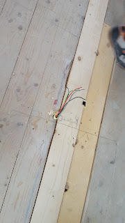 Jeanine heeft de vloer gedicht, wel nadat ze de elektra verlegd heeft zodat die precies in de nieuwe wand uitkomt. Deze leiding moet blijven zodat we vanaf beneden en boven het licht aan/uit kunnen doen (hotel/wisselschakelaar). En aangezien de gang beneden heel mag blijven gebruiken we de bestaande pvc leidingen.