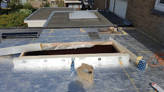 Hier komt het daklicht / dakraam. Ook hier willen we leefvocht binnenhouden dus het plastic moet ook hier tussen hout (en de kieren) en het isolatiemateriaal.