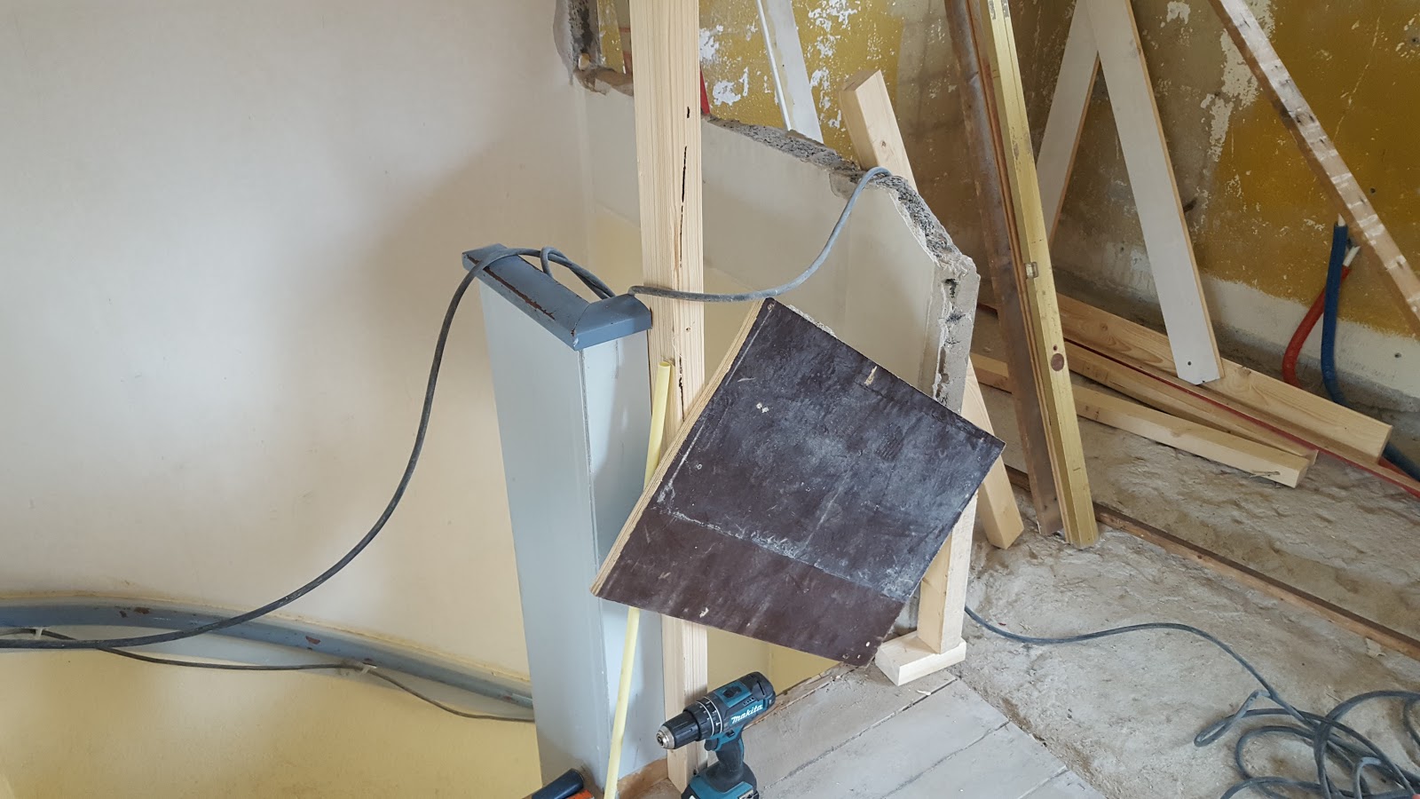 Jeanine heeft de vloer gedicht, wel nadat ze de elektra verlegd heeft zodat die precies in de nieuwe wand uitkomt. Deze leiding moet blijven zodat we vanaf beneden en boven het licht aan/uit kunnen doen (hotel/wisselschakelaar). En aangezien de gang beneden heel mag blijven gebruiken we de bestaande pvc leidingen.