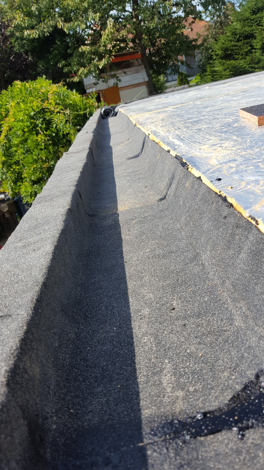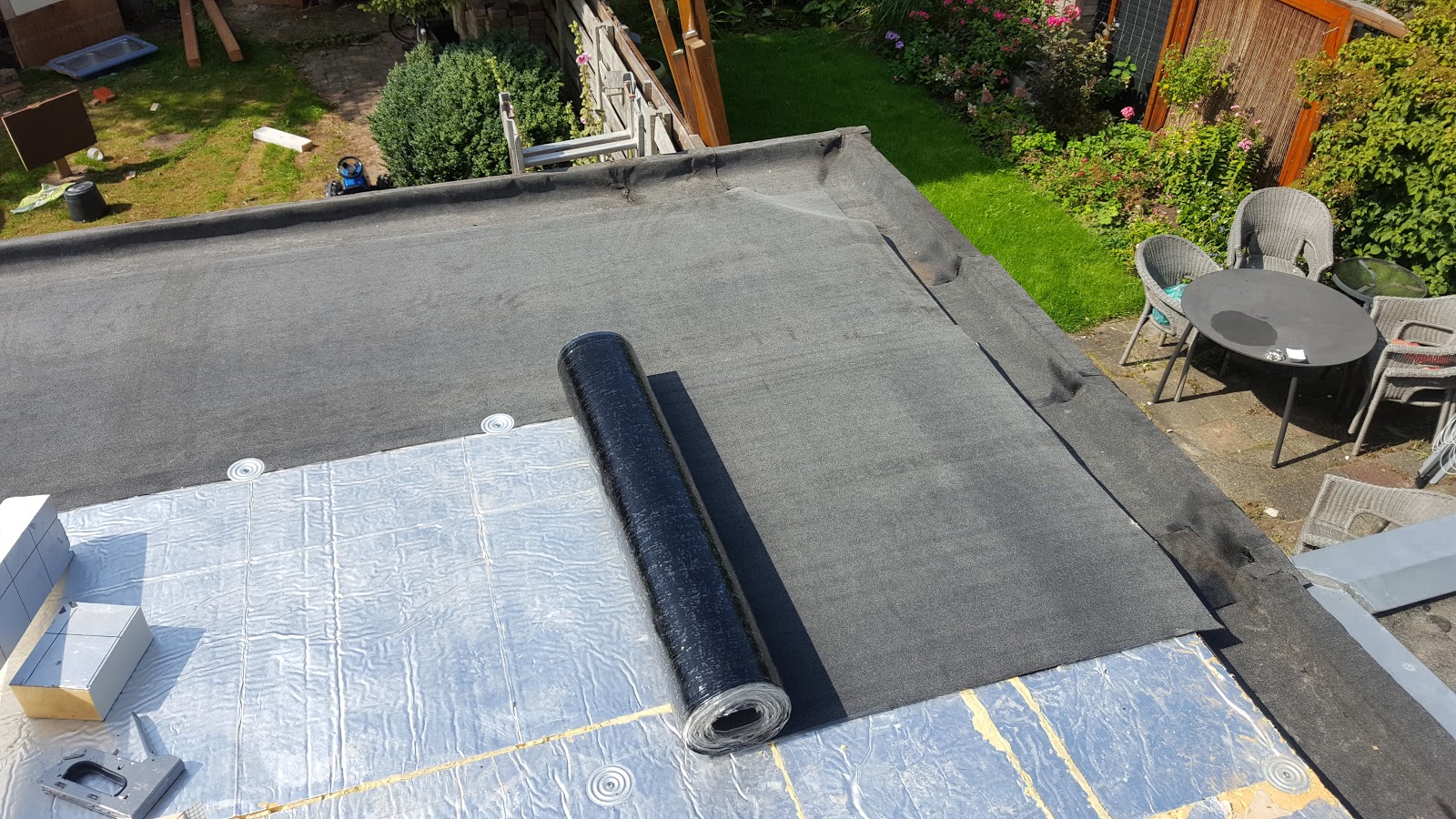 Op het eerste stuk na ben ik best tevreden over mijn brandkwaliteiten. Het zal nooit mijn hobby worden. Het is ook een beetje dubbelop. We gaan uiteindelijk een EPDM dak doen maar dat kon niet plakken op het zilverfolie van de isolatie. Dus moest er een ondervloer, en dat werd een 3mm bitumen ondervloer… die ik dan weer waterdicht wil leggen. Ik schroef enkel met plaatjes op de randen die ik dan weer overplak. Mijn doel: een onderdak (of nooddak) dat ook waterdicht is.