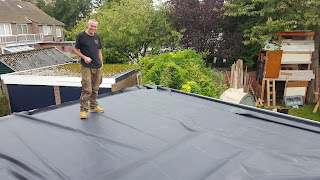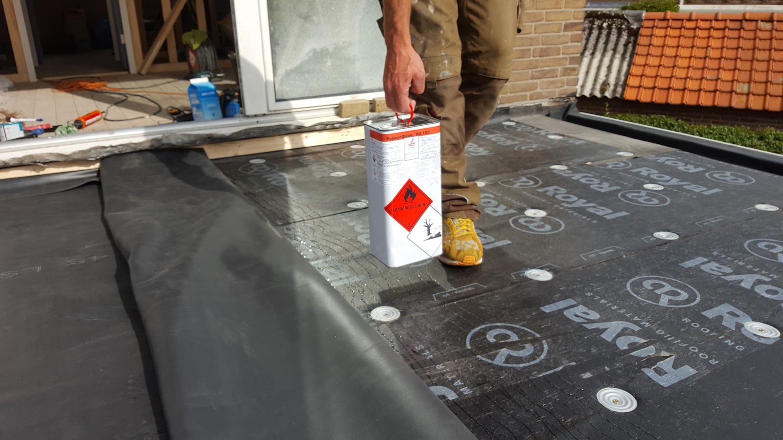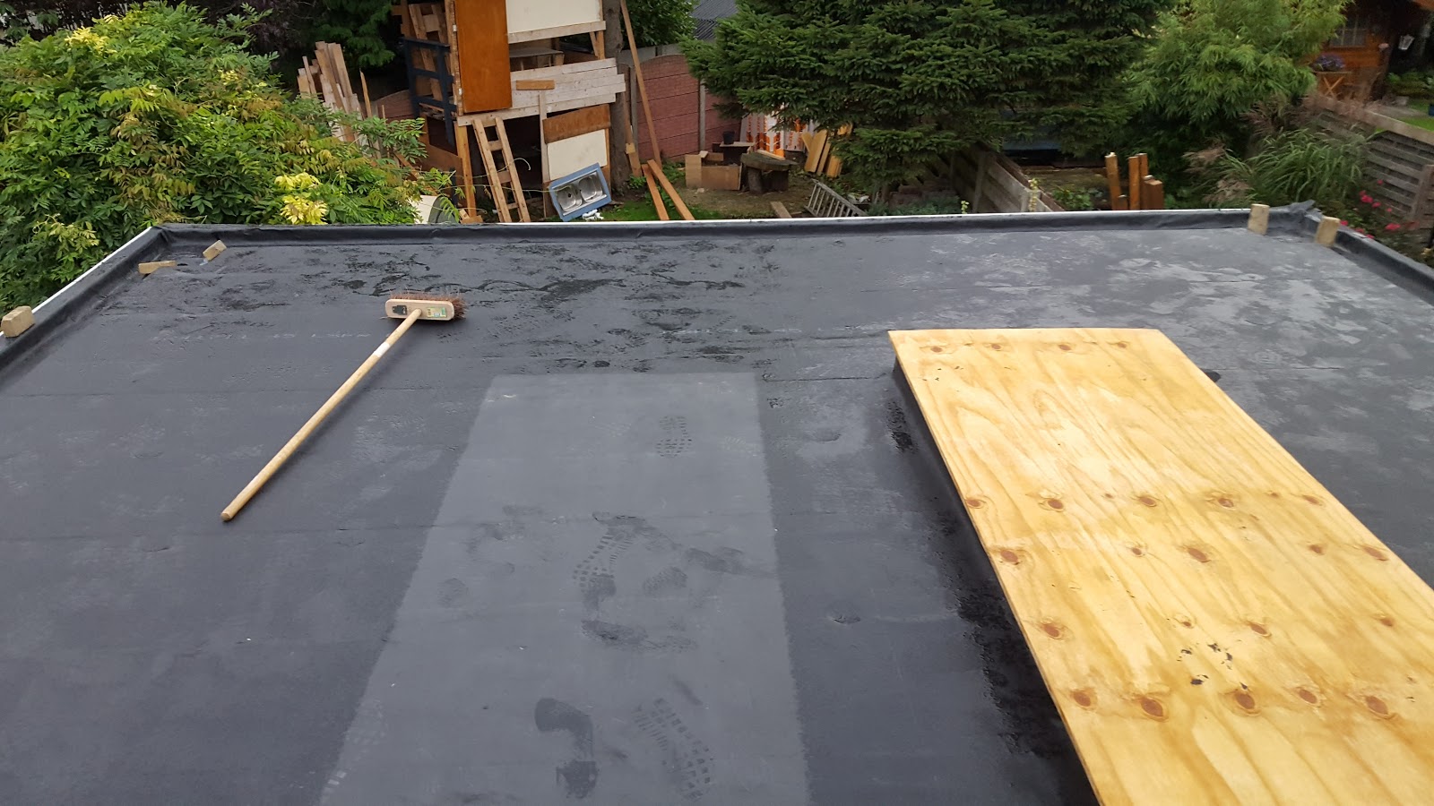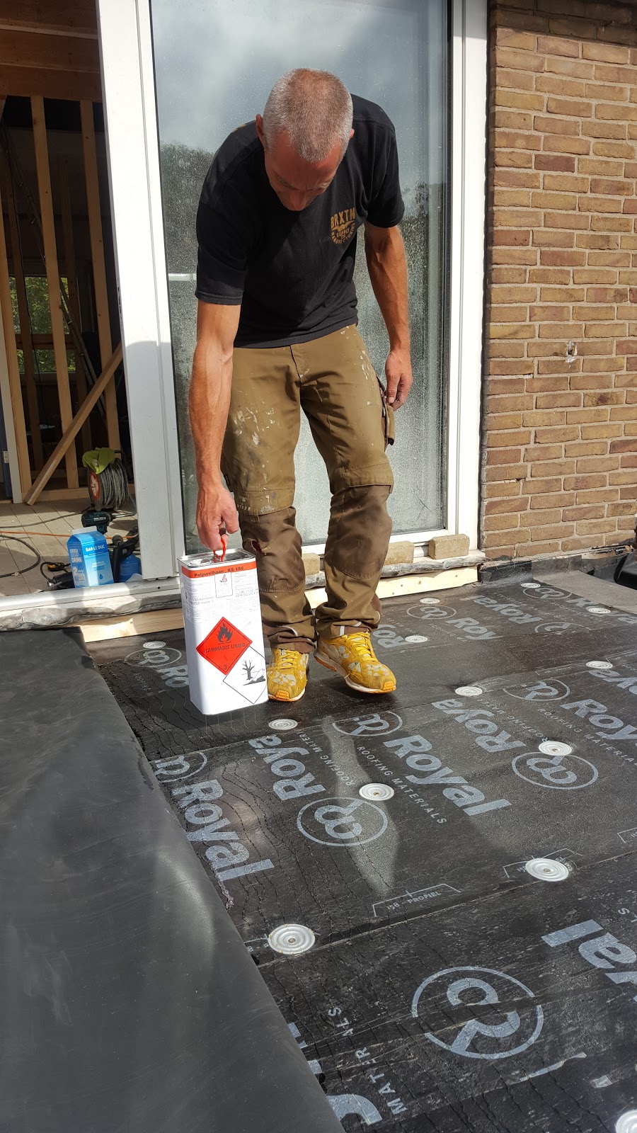 Vandaag helpt mijn lieve maat Floris mij met het aanbrengen van het EPDM folie. Als eerste hebben we de goten geplakt met EPDM plakstroken en contactlijm. Daarna het grote vlak.