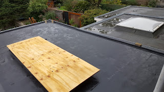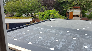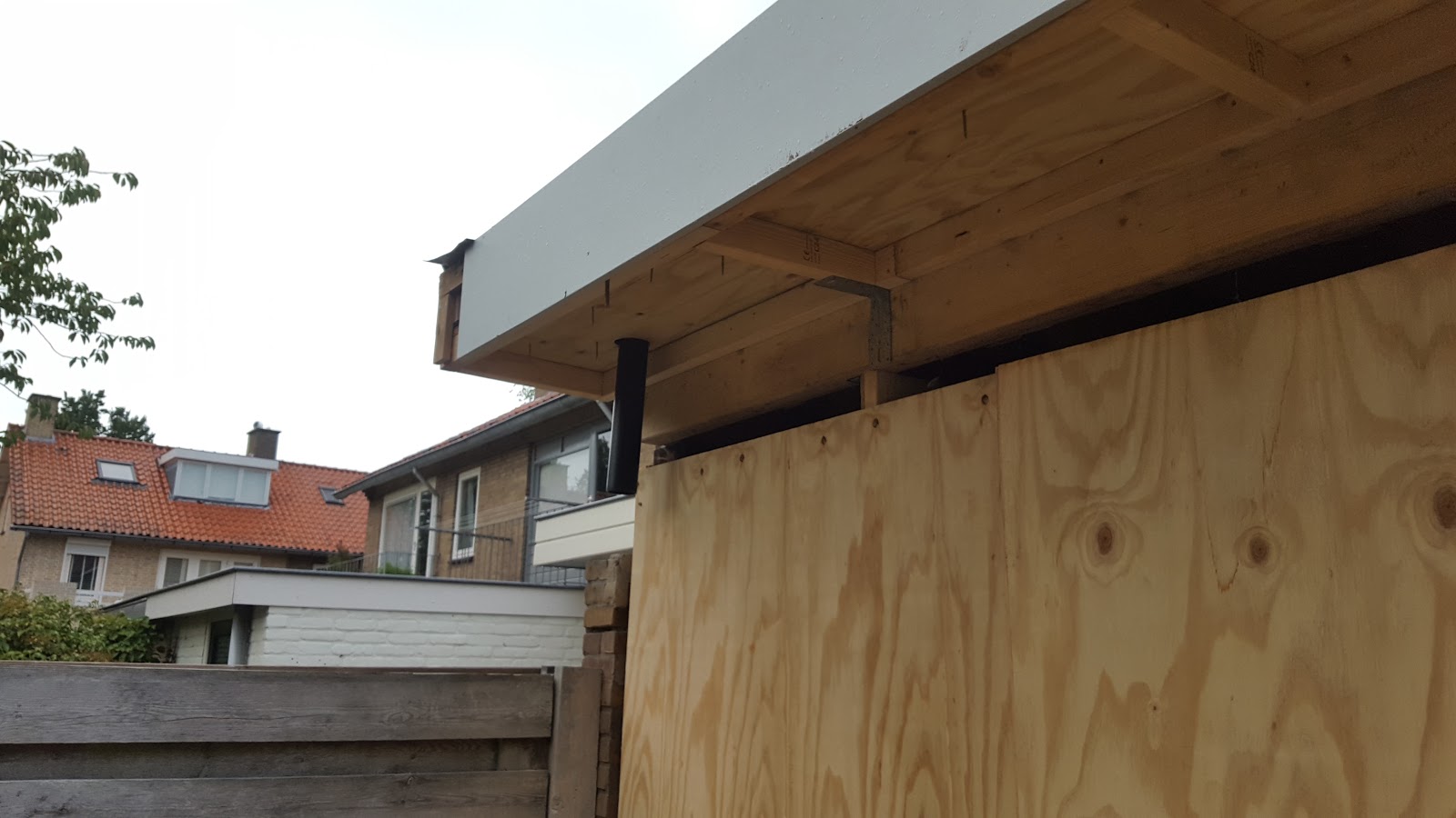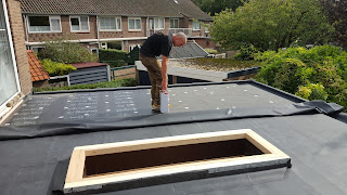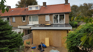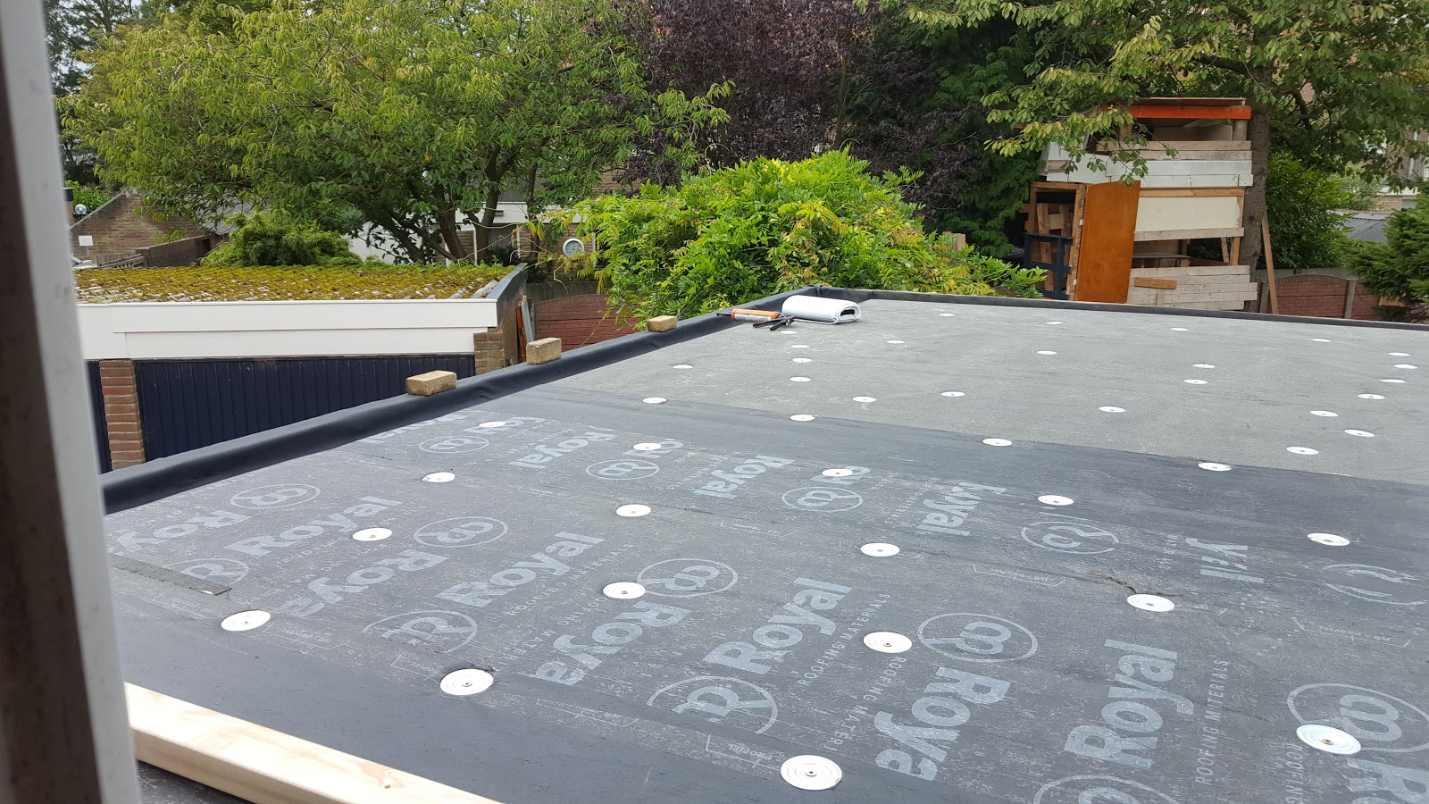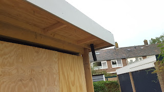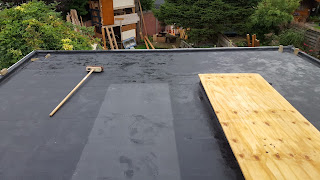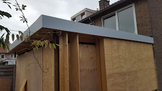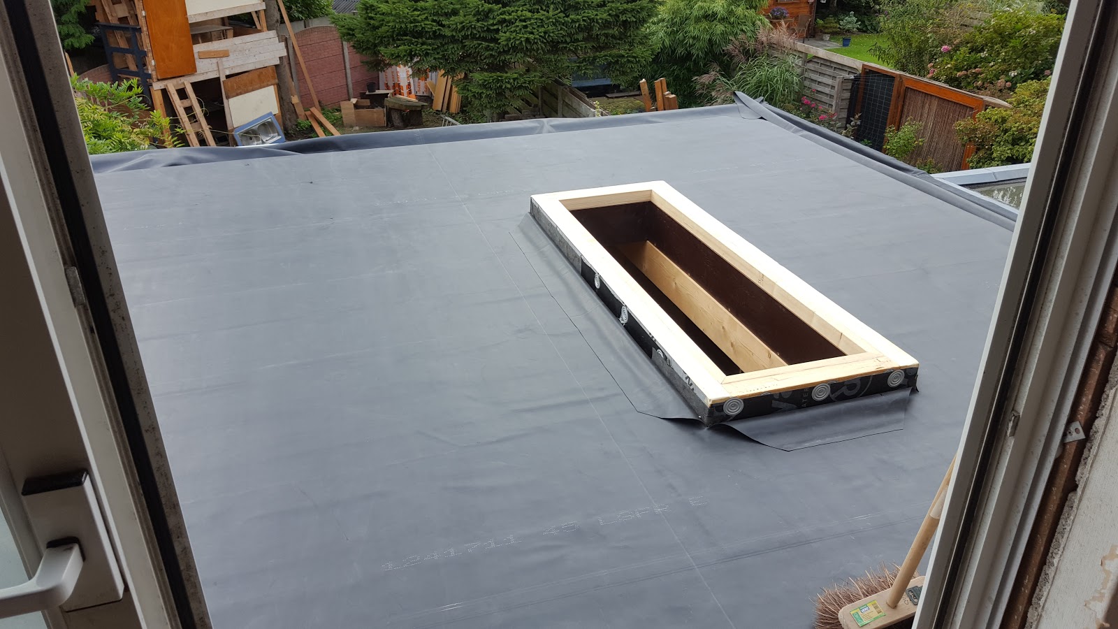 Vandaag helpt mijn lieve maat Floris mij met het aanbrengen van het EPDM folie. Als eerste hebben we de goten geplakt met EPDM plakstroken en contactlijm. Daarna het grote vlak.