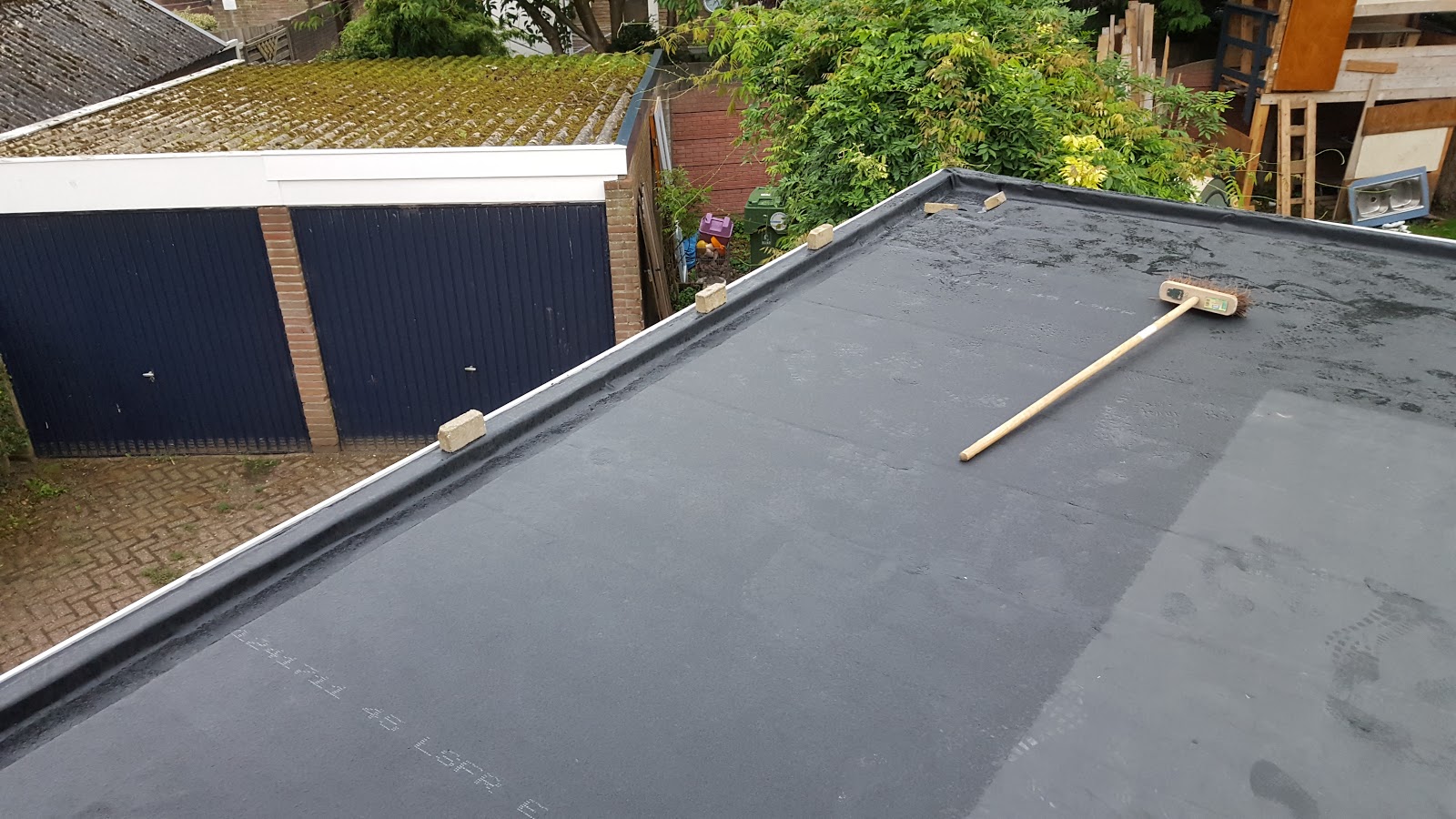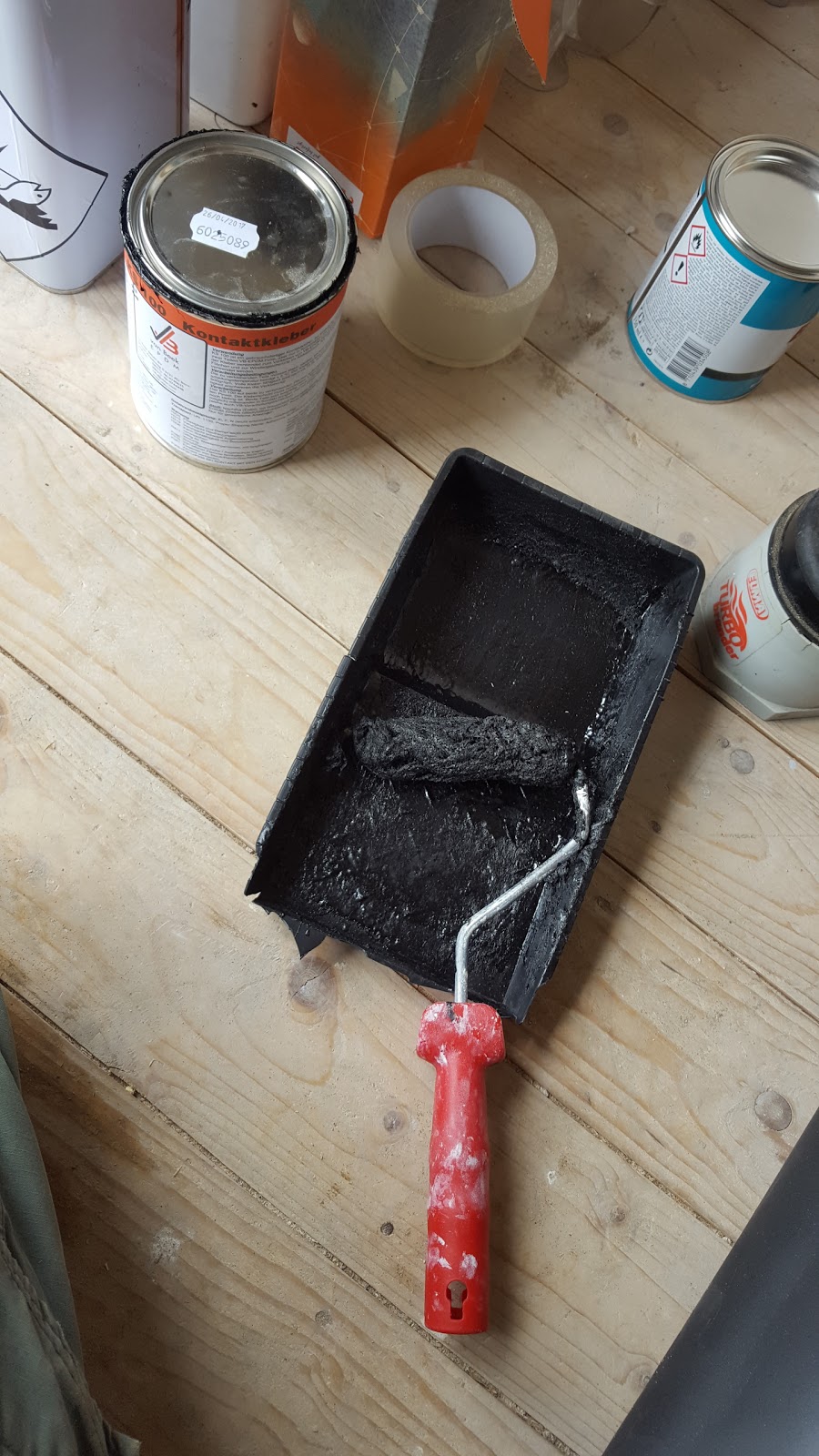 Na het lijmen rol je het EPDM er op door het (als een vloeitje) af te rollen in de lijm. Daarna borstel je het uit. De lijm droogt met zuurstof, dus aan de randen droogt het veel sneller dan in het grote vlak. Ik heb daarom telkens na 15 minuten opnieuw geborsteld en het werd er telkens weer gladder van.