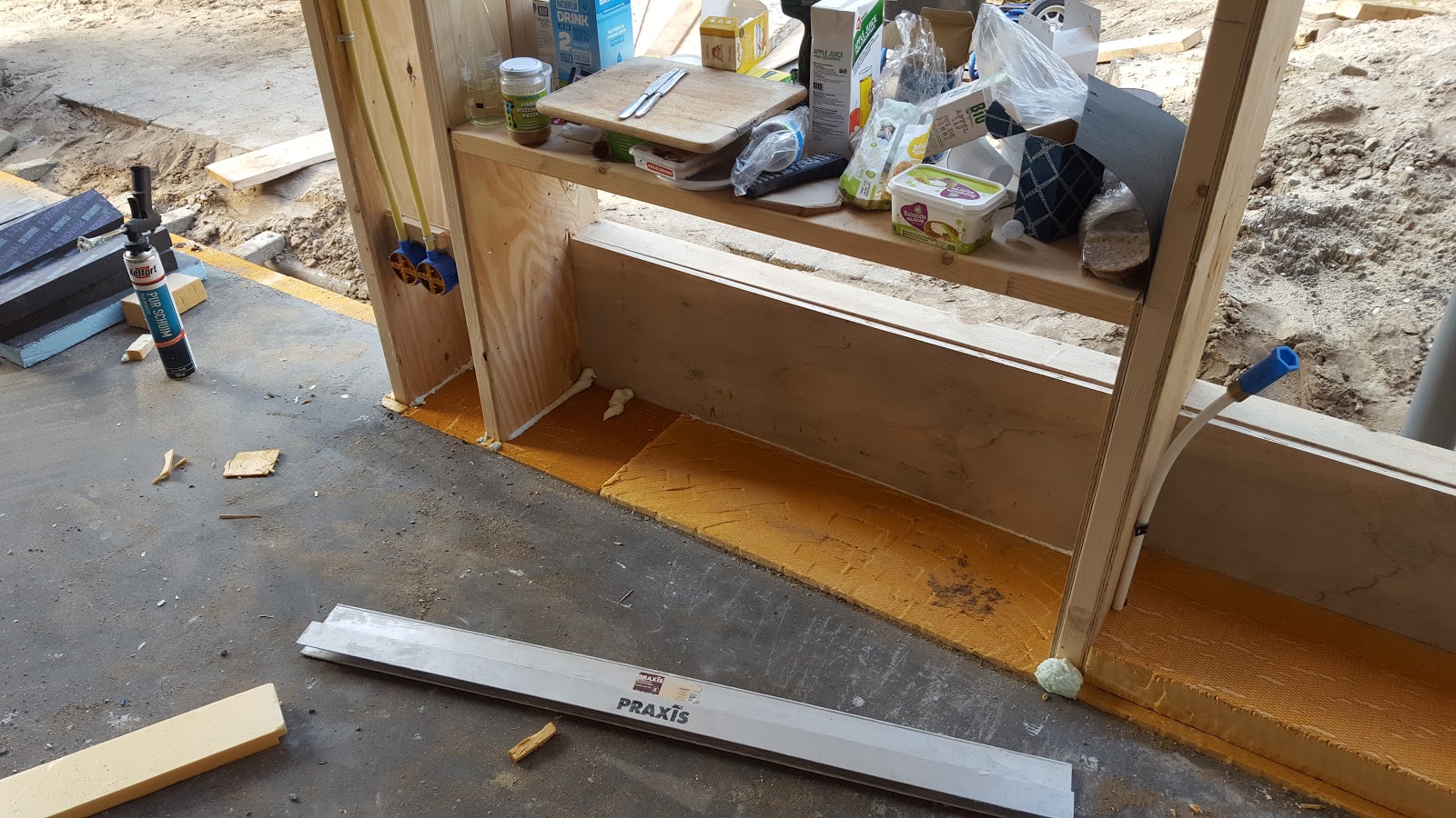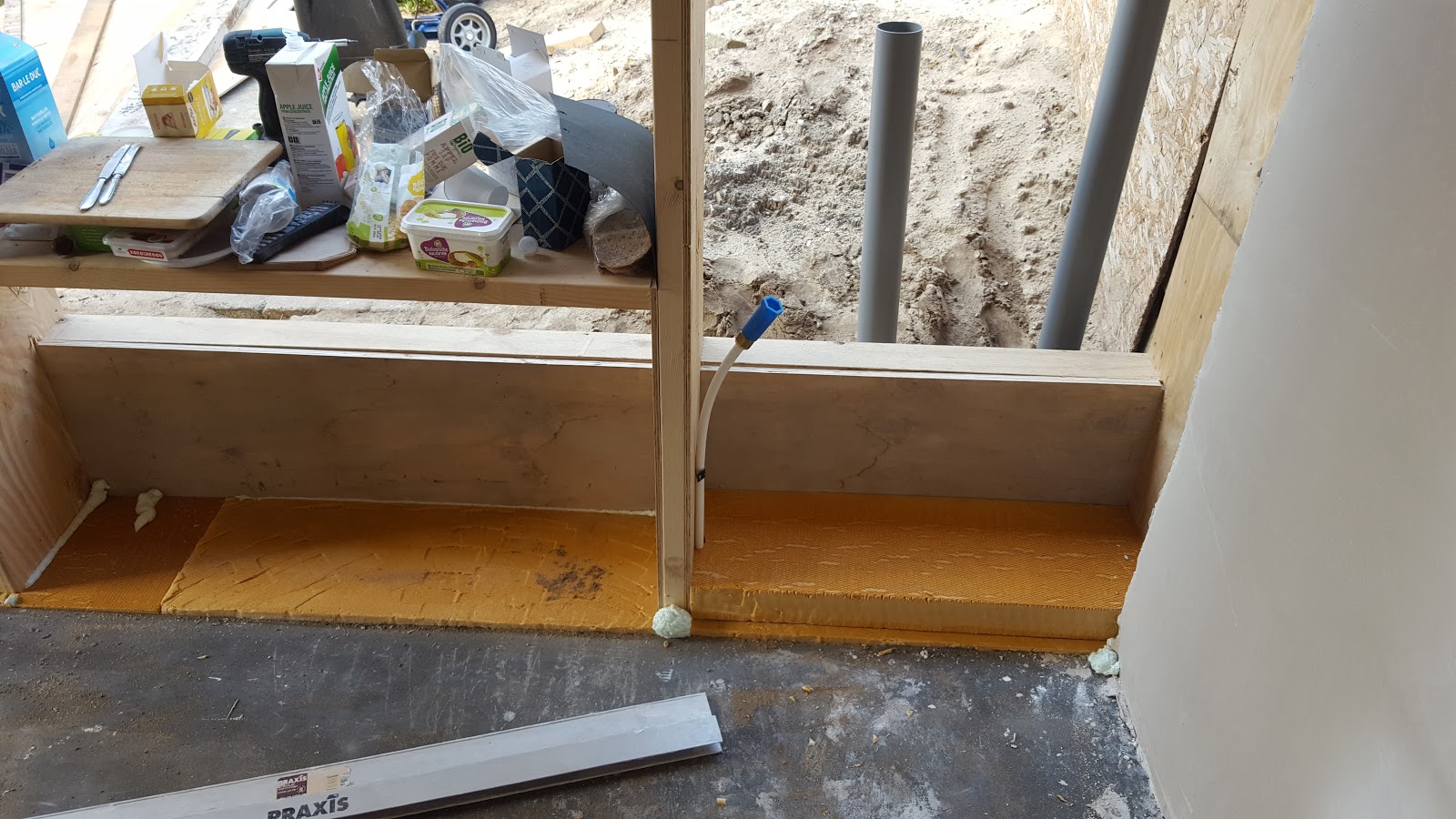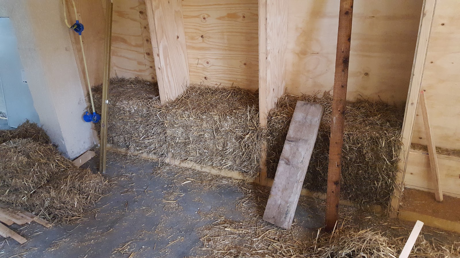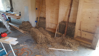 Vandaag houtskeletbouw (HSB) afmaken. We hogen alles nog 1 laag met XPS op zodat het stro nooit op het niveau ligt dat het nat kan worden (stel je voor bij lekkage in of buiten het huis).