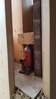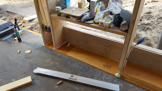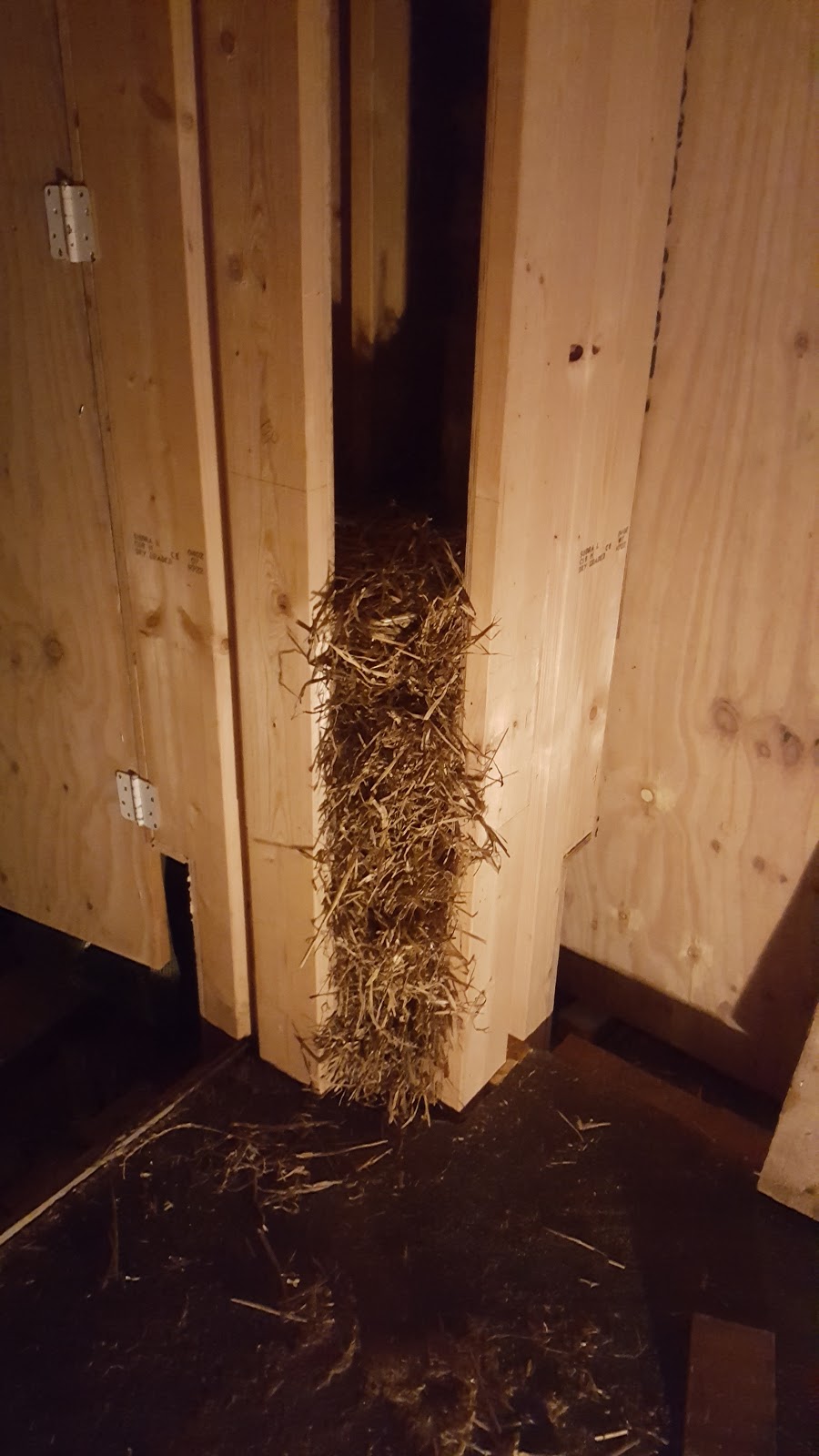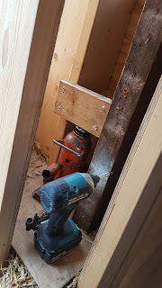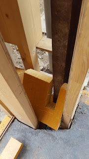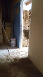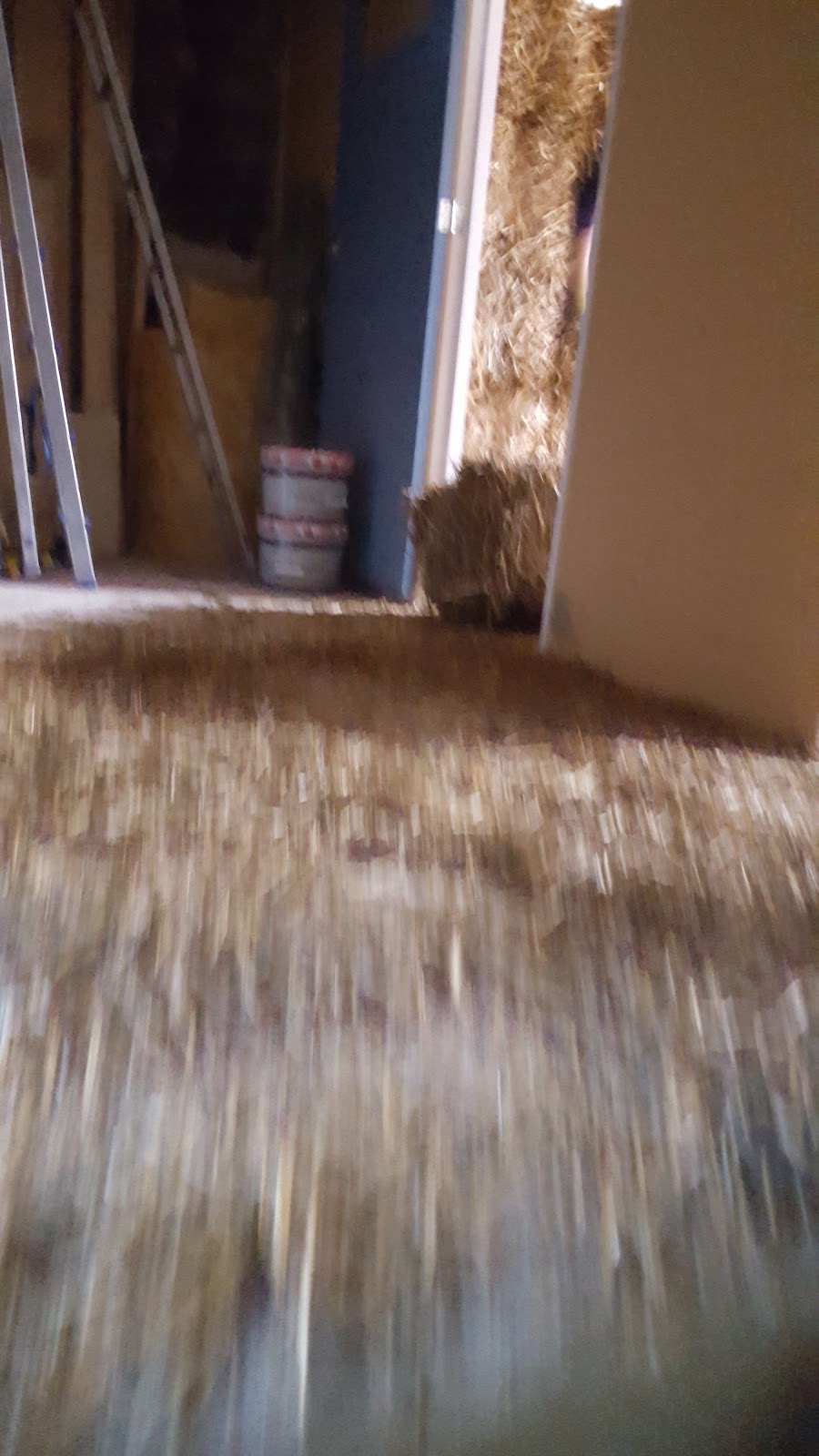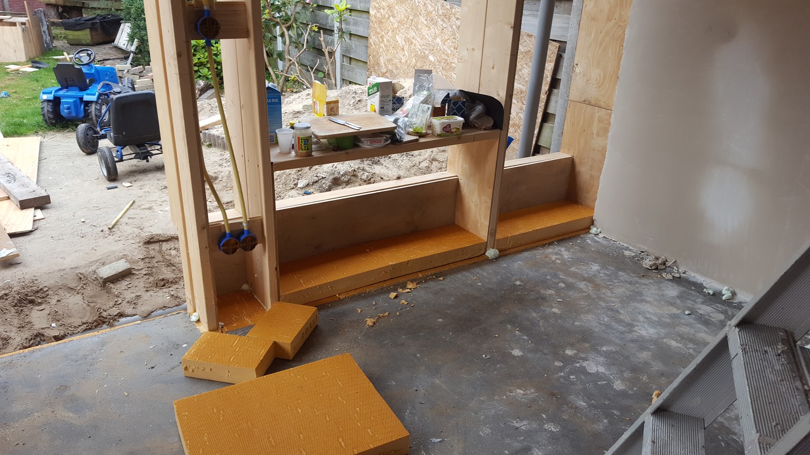 Vandaag houtskeletbouw (HSB) afmaken. We hogen alles nog 1 laag met XPS op zodat het stro nooit op het niveau ligt dat het nat kan worden (stel je voor bij lekkage in of buiten het huis).