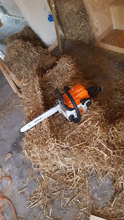 Met veel dank aan Maarten voor het lenen van dit ronkende apparaat. Eerst de recipro geprobeerd maar dat is geen optie. Deze motor kettingzaag snijdt er doorheen als boter. Handig om de eerste 4 balen te plaatsen omdat daar een rand uit moet. Die achterste rand is zodat er buiten een borstwering gemetseld kan worden.