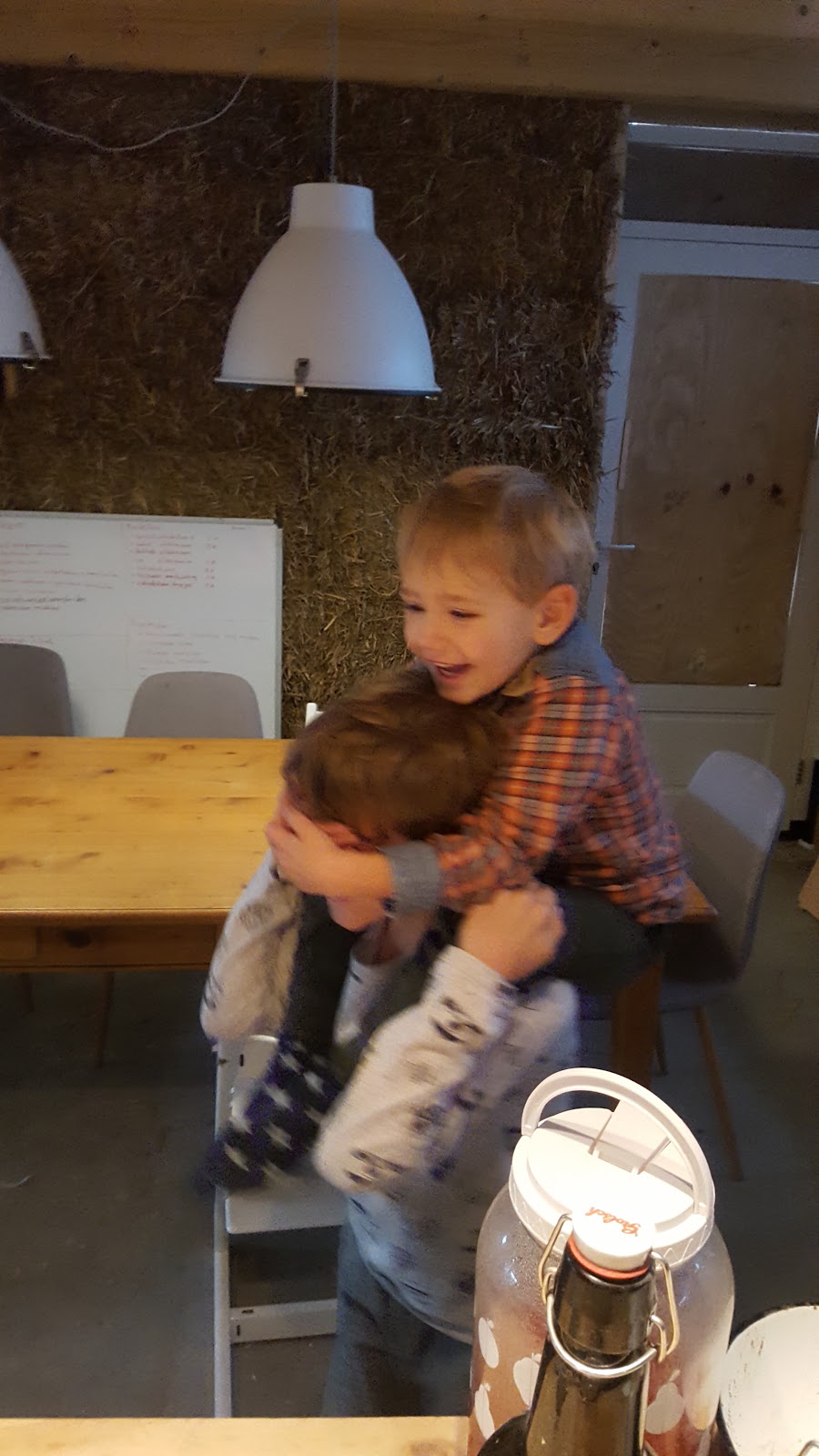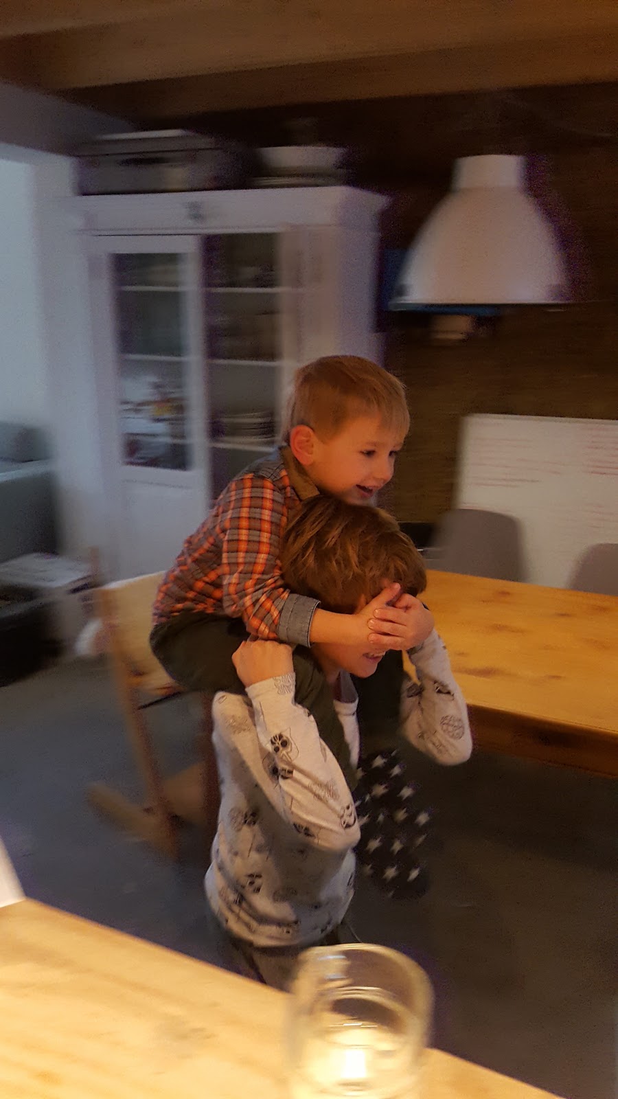 Op zijn schouders, rondjes laten rennen en dan telkens express zijn handen voor de ogen van zijn broer terwijl die door blijft rennen terwijl hij gilt ‘niet doen dat is gevaarlijk’ 😉